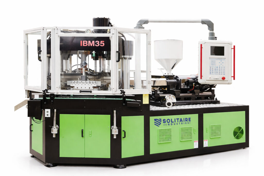 The IBM35 is used to manufacture hollow plastic products such as bottles, containers, and medical packaging by combining injection and blow molding in one efficient process.