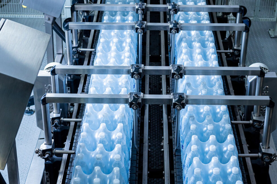 Next, the system transfers the preform to a blowing station, where compressed air expands it into the final bottle shape.
